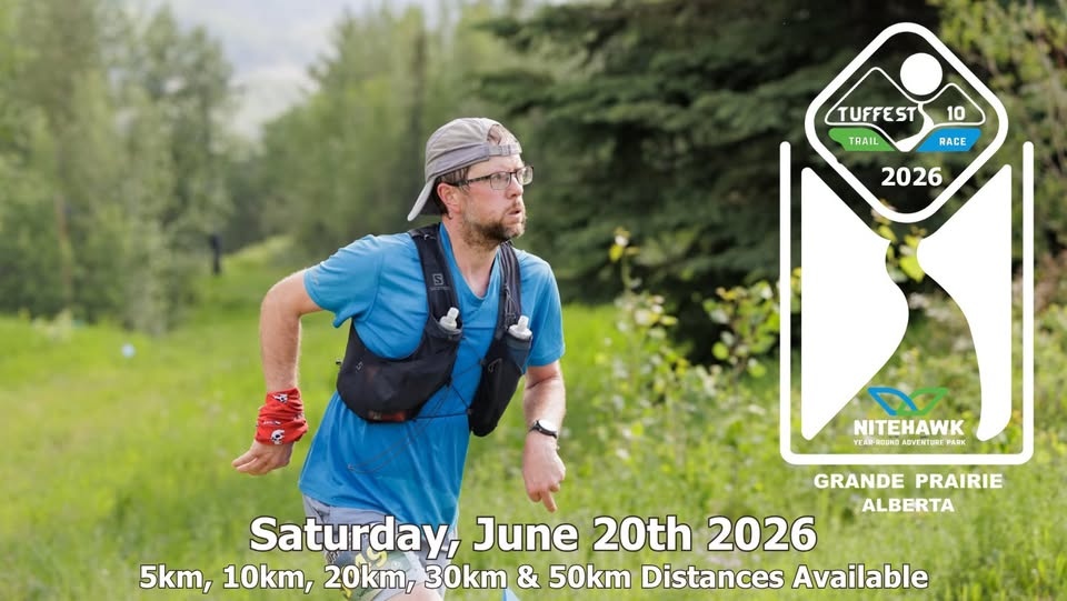 Tuffest 10 Trail Race, Grande Prairie, AB: Join us for the 12th Annual “Tuffest 10″ Trail Race, Saturday, June 20th, 2026. With 5km, 10km, 20km, 30km and our ULTRA 50KM, this event has something for all fitness ability levels. Run or hike, have fun with friends, and experience new trails!